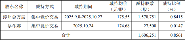 近日,公司收到蔡冬娜出具的《股份减持计划实施完成告知函》,获悉其股份减持计划已实施完成。2025年10月24日,蔡冬娜通过集中竞价交易方式,减持27,500股,减持比例为0.0147%,减持均价为174.68元/股,减持总金额为480.37万元。