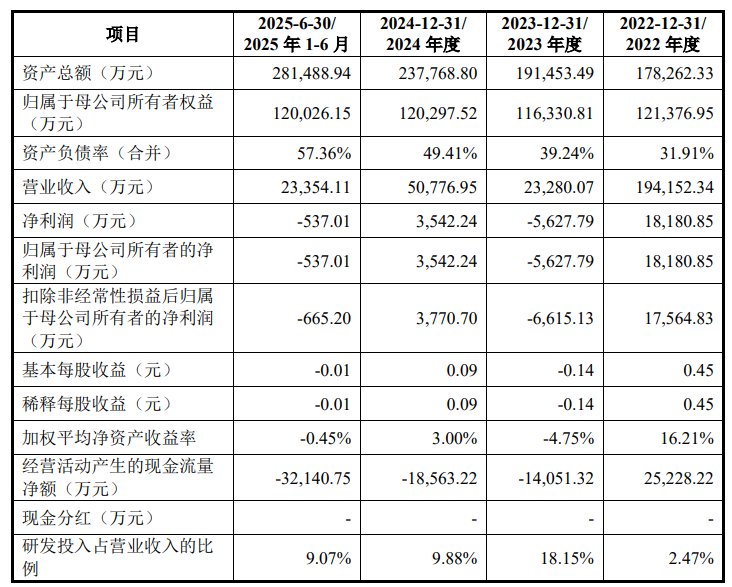 财务方面,于2022年度、2023年度、2024年度及2025年1-6月,公司实现营业收入约为19.42亿元、2.33亿元、5.08亿元、2.34亿元人民币;同期,净利润分别约为1.82亿元、-5627.79万元、3542.24万元、-537.01万元人民币。