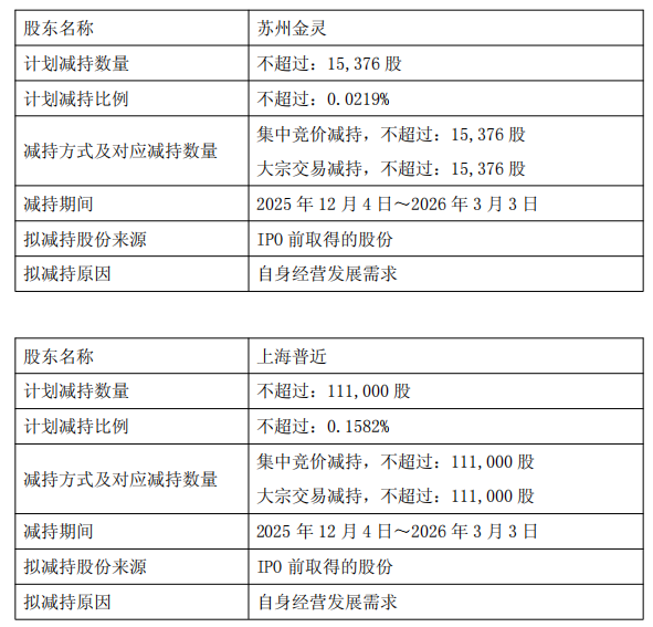 南京金溧、苏州金灵和上海普近因自身经营发展和资金需求计划拟通过集中竞价、大宗交易等方式减持所持有的公司部分股份,股东的减持价格按照市场价格确定,减持期间为自公告披露之日起3个交易日后的三个月内。相关股东均为持股5%以下股东,均不属于公司控股股东、实际控制人或董监高,本次披露减持计划为履行在招股说明书中载明的减持公司股份将提前3个交易日公告的承诺。