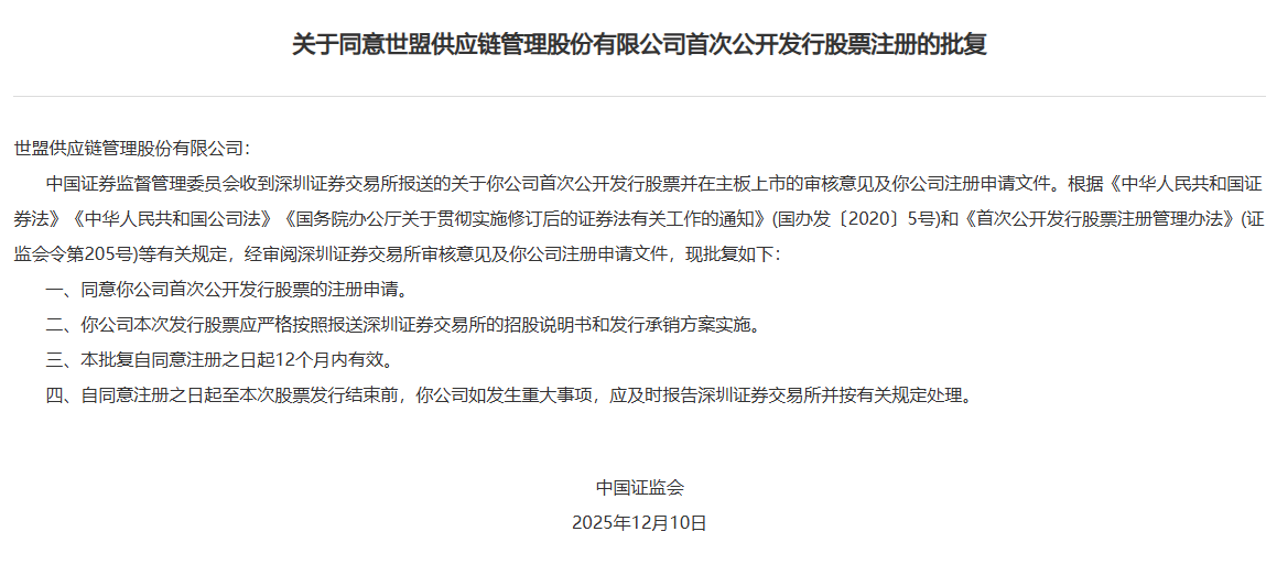 12月12日,中国证监会发布《关于同意世盟供应链管理股份有限公司首次公开发行股票注册的批复》。据悉,世盟股份拟在深交所主板上市,()为其保荐机构,拟募资7.0842亿元。