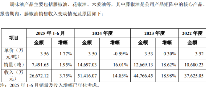 报告期内,公司营收增势向好,从2022年的4.5亿元上升至2024年的6.25亿元,2025年上半年达到3.32亿元,核心品类调味油是期内主要收入来源,营收占比超90%,调味油产品主要包括藤椒油、花椒油、木姜油等,其中藤椒油是公司产品矩阵中的核心产品。