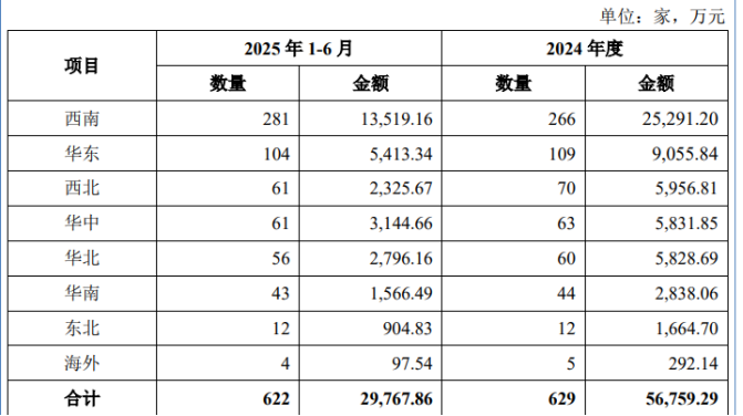 证券之星注意到,公司主要借助经销渠道扩大终端市场覆盖面,期内来自经销渠道收入占比主业收入比重超九成。进一步看,以川渝为核心的西南地区是公司的营收基石,2024年的销售额达2.53亿元,占全年总销售额的40.48%,对应的经销商数量高达266家,至2025年上半年,来自西南地区的收入为1.35亿元,经销商数量攀升至281家。可以看出,西南地区的收入稳健,但增长并非爆发式,公司需向外寻求增量。