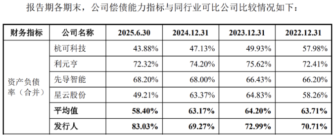 此外,公司处于快速发展期,运营资金和固定资产等投入较大,公司资产负债率高于同行业可比公司平均水平。截至2025年6月末,恒翼能资产负债率达83.03%,高于行业均值的58.5%。公司解释称,主要系2025年上半年公司订单激增,采购同步增加,导致应付账款、应付票据大幅增加。