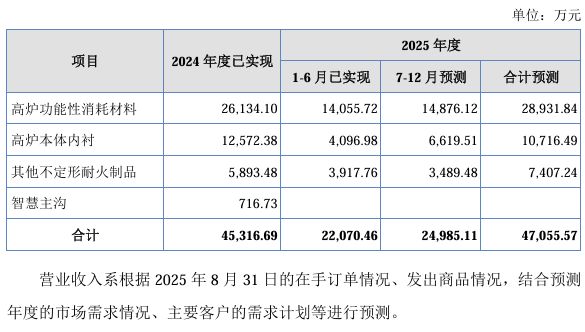 公司以“高炉守护者”为定位,为高温高压作业的炼铁高炉提供全生命周期技术方案,从核心的功能性消耗材料到定制化内衬装备,构建起覆盖高炉运行关键环节的产品体系。其中,“高炉功能性消耗材料”其作为核心“现金牛”业务,凭借高频复购属性与稳定性能,收入占比持续提升至60%左右,成为支撑企业稳健发展的核心引擎。“高炉本体内衬”则作为高毛利率产品持续拉动公司盈利能力提升。
