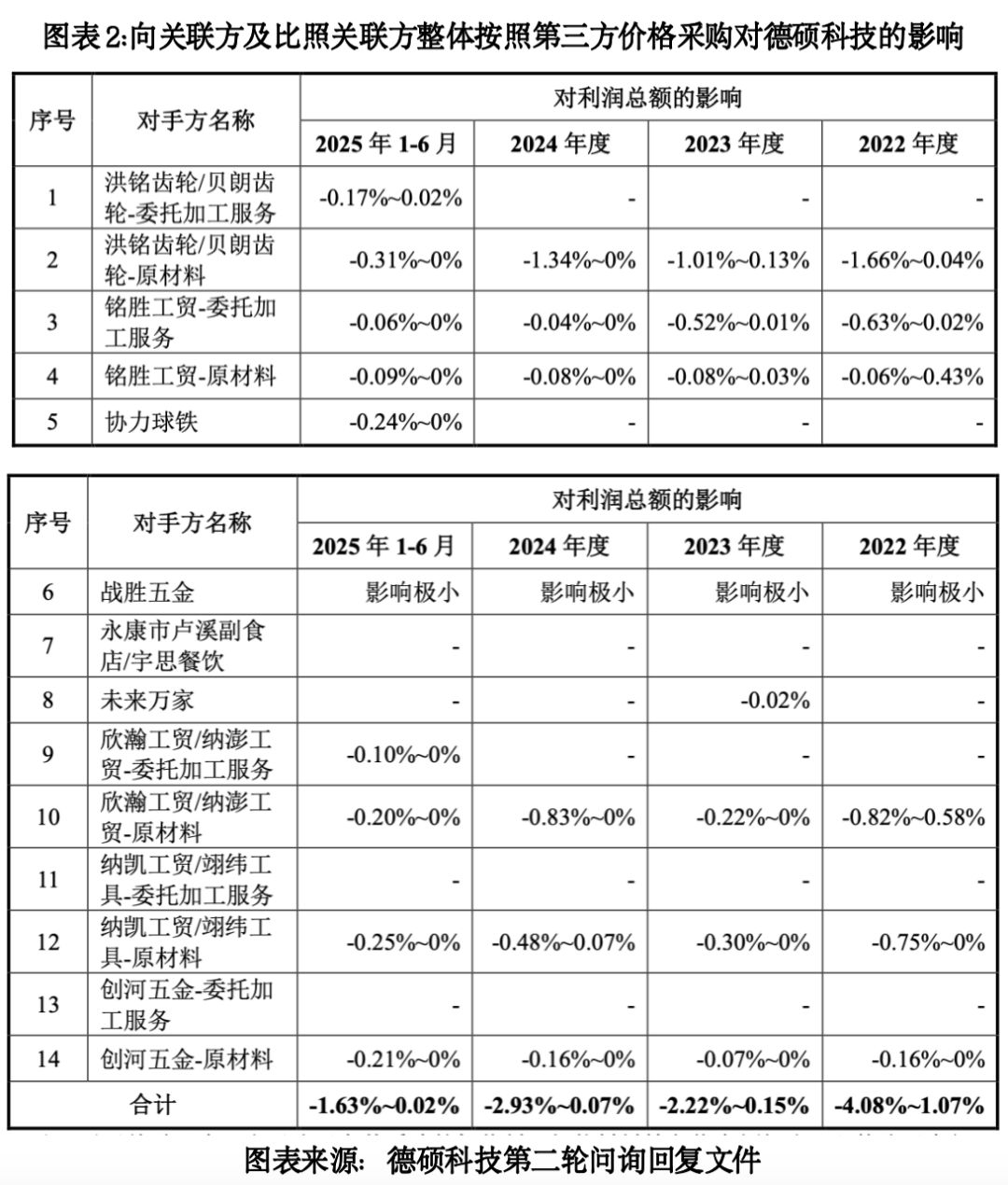 第二轮问询回复文件显示,假设德硕科技按照向非关联第三方采购价格等市场价格向关联方及比照关联方采购,报告期各期对其利润总额的影响分别为-4.08%~1.07%、-2.22%~0.15%、-2.93%~0.07%、-1.63%~0.02%。